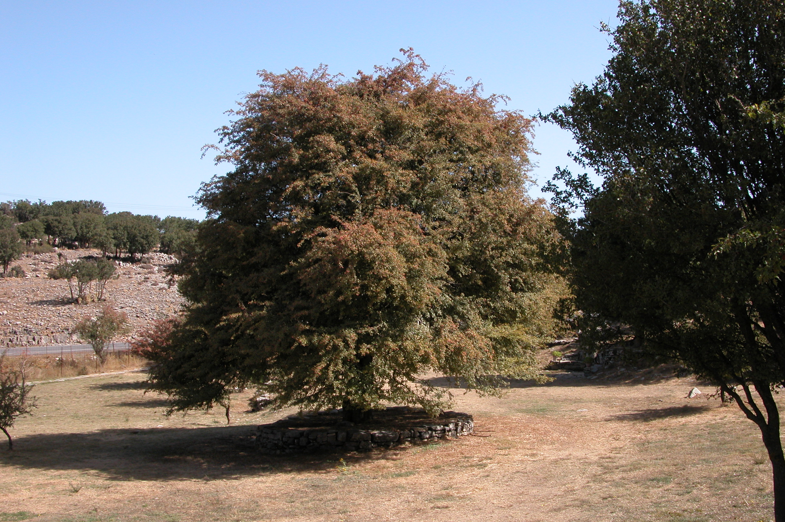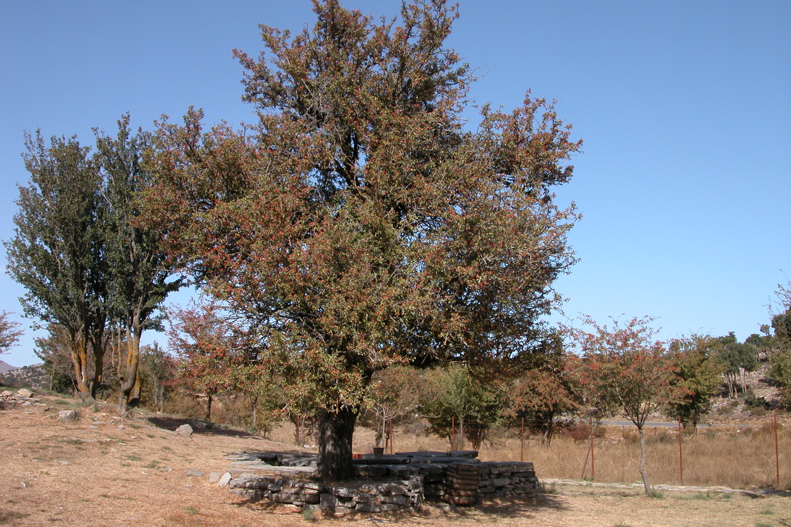 The hawthorn tree grows at an altitude of 1.187 m. in the plateau of Zominthos, on the northern outskirts of the mountain range of Psiloritis. It is located 9 km away from the village of Anogia and it is in the middle of the route to the Idaion Andron. Scattered trees grow in the wider area, such as oaks (Quercus coccifera), maples (Acer sempervirens ssp. creticum), hawthorn and wild pear trees (Pyrus amygdaliformis).