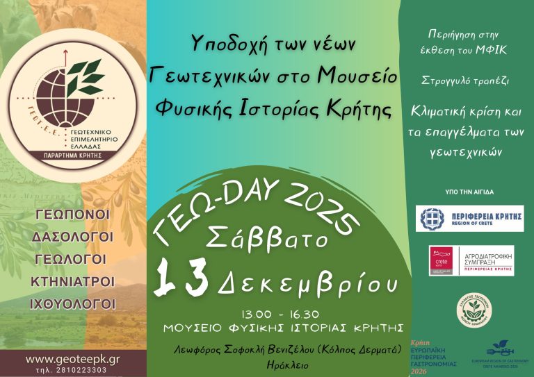 Η πρώτη εκδήλωση «ΓεωDay 2023» θα πραγματοποιηθεί την Τετάρτη 22 Νοεμβρίου και ώρα 4.30 μμ – 9.00 μμ στο χώρο του ΕΛΓΟ ΔΗΜΗΤΡΑ δίπλα στα γραφεία του παραρτήματος, οδός Τερμα Θεμιστοκλέους, Ηράκλειο.